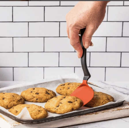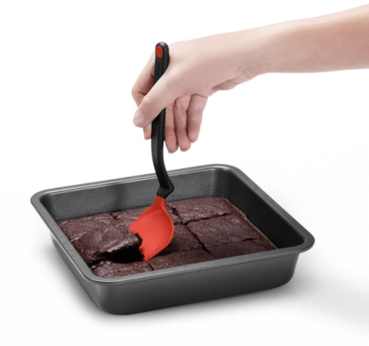 “This is an example of thinking outside the box. They have an unusual form on the handle that keeps your spatula from touching the counter. It’s light, made from nylon, and flexible. It has an edge to cut things with which is very handy. ‘