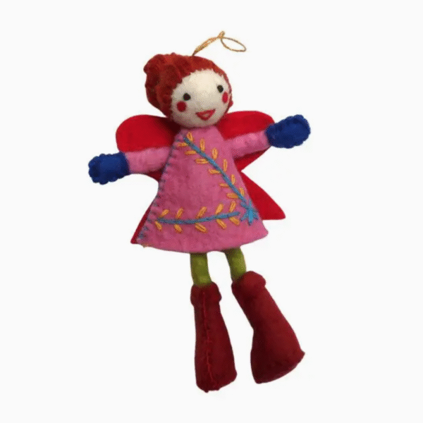 This delightful fairy hanging decoration wears an embroidered pink dress and soft red boots.