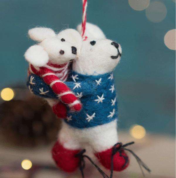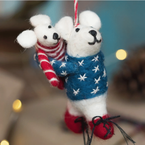 The little one is being given a ride on Mum’s back. Fitted with a red and white hanging thread. Sustainable, eco friendly decorations everyone will love. 8 x 3 x 10cm 100% wool felt This supplier became the first Fair Trade USA certified company in Nepal.