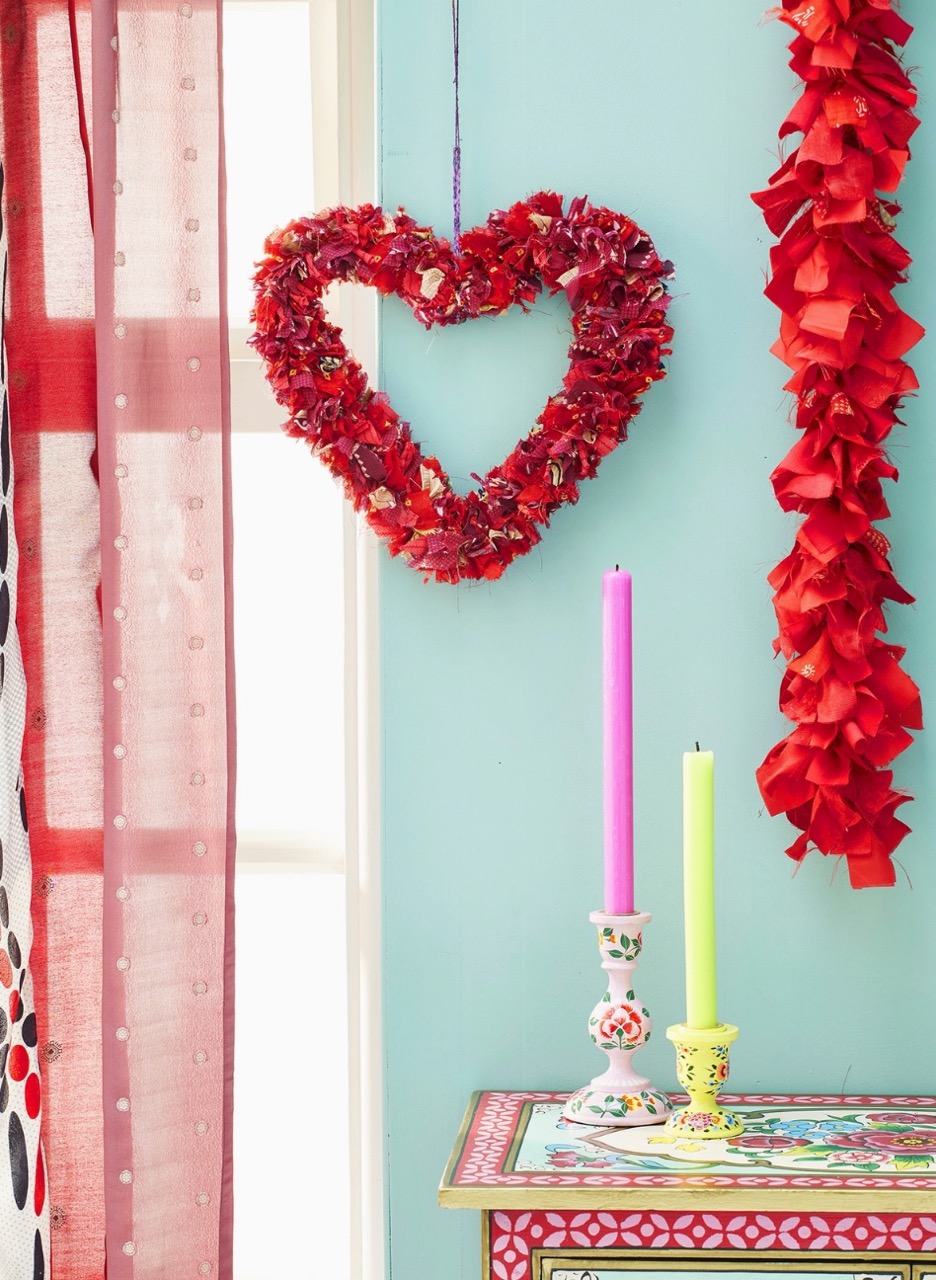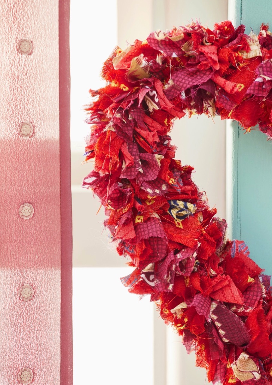 This fancy fabric wreath is handcrafted from a mixture of red offcuts with a textured finish, combining to give a homely feel.